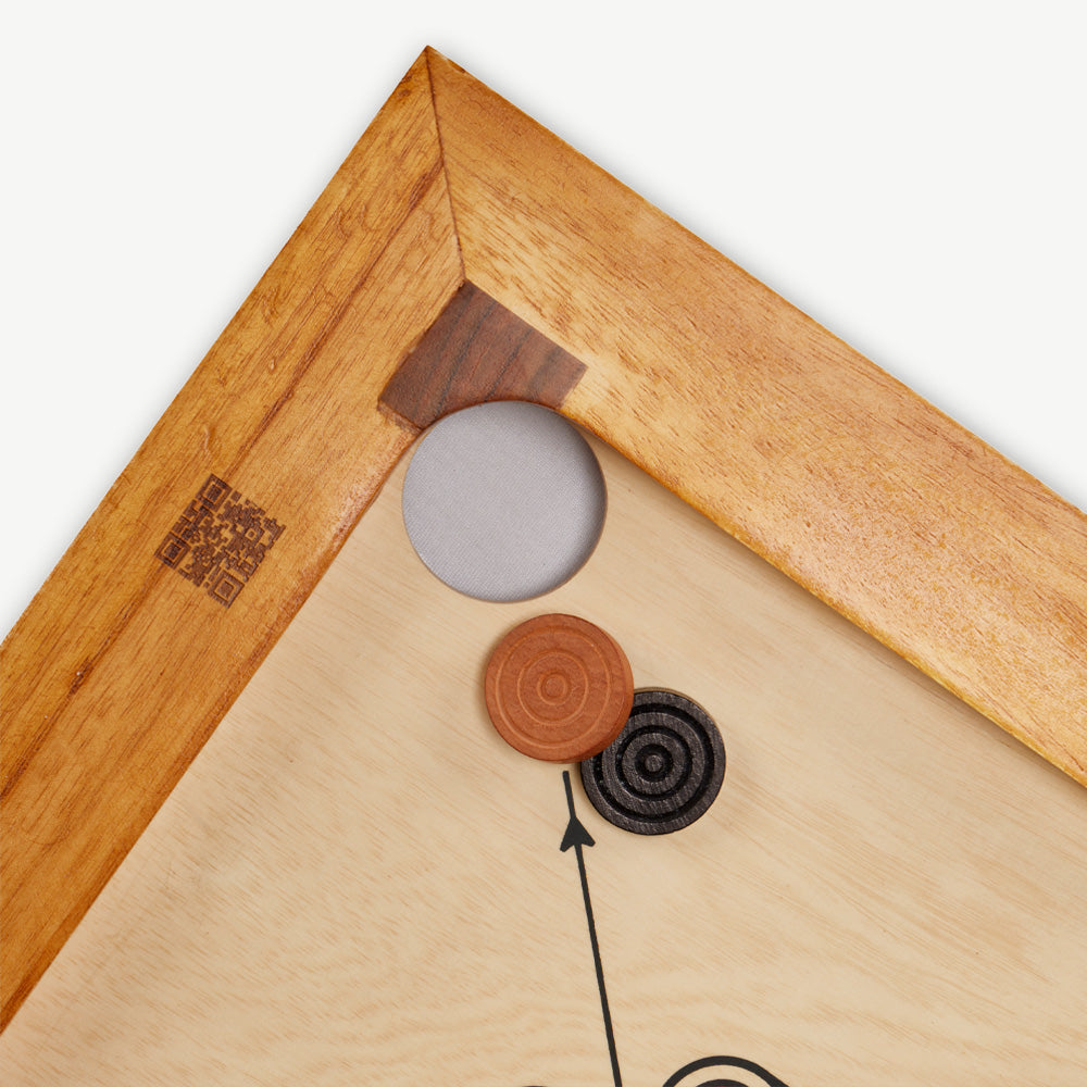 This Junior Carrom Set is the perfect board for younger players, and families or as an entry-level board. Our carrom board edges are made of 2″ Drake Wood with Kikar detail corners for the ideal rebound and the playing surface is made from 4mm thick special Carrom Mango Plywood which has been polished for a smooth low friction and hard wearing finish.